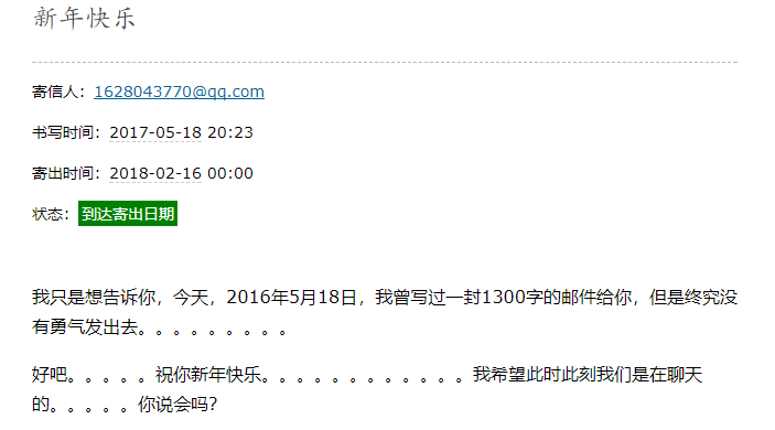 我收到了你在17年5月所发的时光邮件,很可惜,当时我们已经没有继续联系了,我很好奇2016年5月18日你所写的1300字的邮件,但如今,我也不好意思去问了。自从17年8月份开始,我看到你连空间都关闭了,就怀疑你这个QQ已经不再使用了。虽然曾想过找相关的人寻找你的近况,但后来想想看,明知当前是不可能选择答应的,找到你,又能做到什么呢,无非是徒增你的不快而已。也因此,8月底的那天,你发的信息我没有选择回复,哪怕做的这些事伤透了你的心,也比让你持续的受到伤害更好,至少我的选择是这样的。